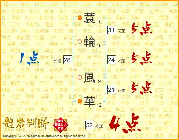 蓑(16画)輪(15画) 風(9画)華(12画)