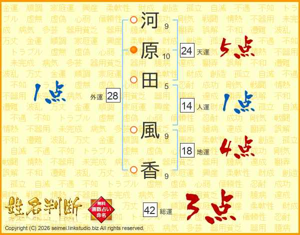 河(9画)原(10画)田(5画) 風(9画)香(9画)