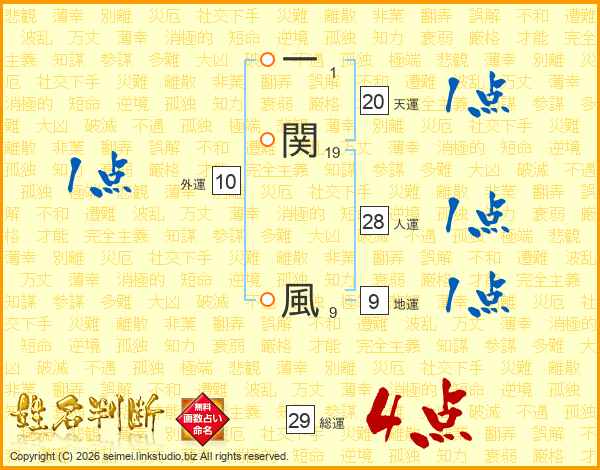 生活面を象徴する運勢です。外部から受ける影響力を表し、結婚運、家庭運や職場、環境への順応性を表します。総運から人運を引いた画数。姓や名が1文字の場合を除く。