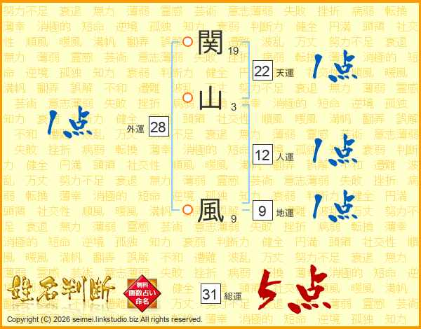 生活面を象徴する運勢です。外部から受ける影響力を表し、結婚運、家庭運や職場、環境への順応性を表します。総運から人運を引いた画数。姓や名が1文字の場合を除く。