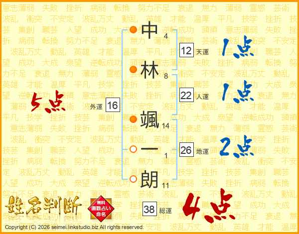 中(4画)林(8画) 颯(14画)一(1画)朗(11画)
