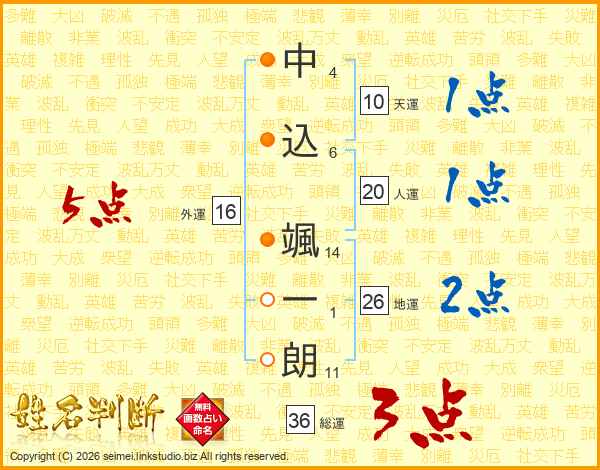 中(4画)込(6画) 颯(14画)一(1画)朗(11画)