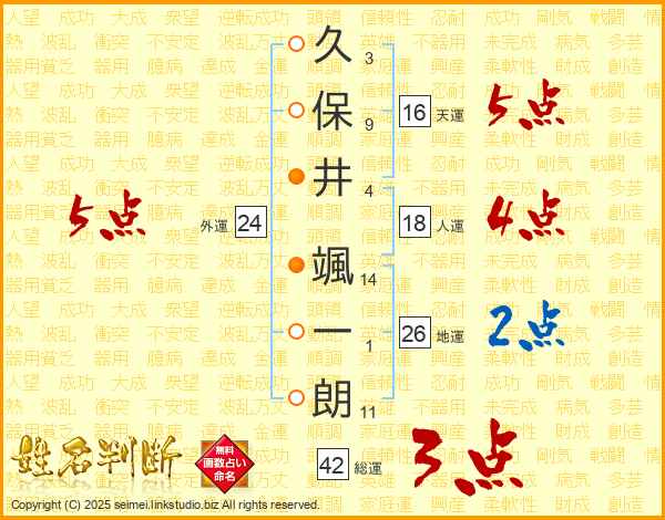久(3画)保(9画)井(4画) 颯(14画)一(1画)朗(11画)