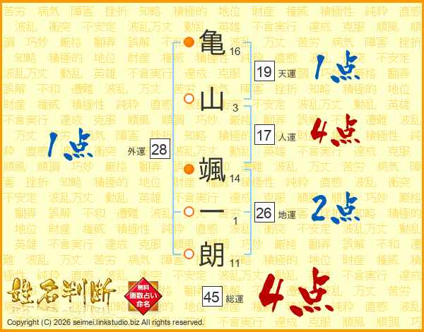亀(16画)山(3画) 颯(14画)一(1画)朗(11画)