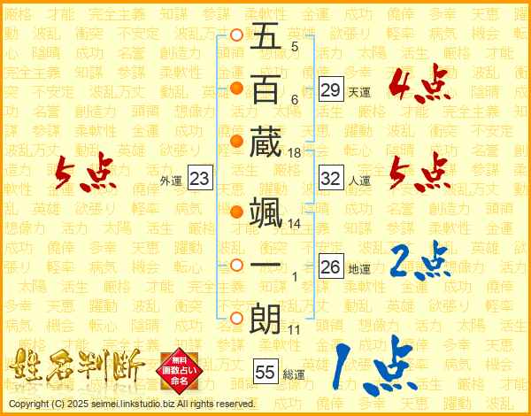 五(5画)百(6画)蔵(18画) 颯(14画)一(1画)朗(11画)