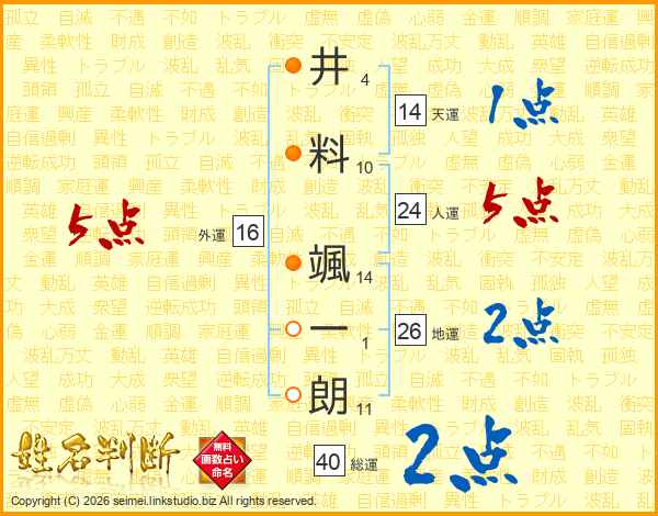 井(4画)料(10画) 颯(14画)一(1画)朗(11画)