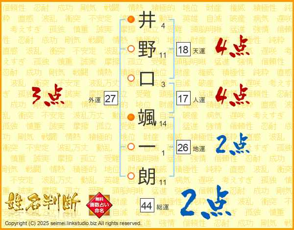 井(4画)野(11画)口(3画) 颯(14画)一(1画)朗(11画)