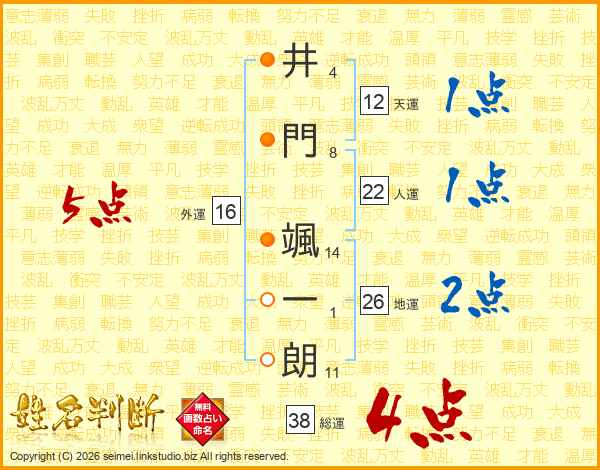 井(4画)門(8画) 颯(14画)一(1画)朗(11画)