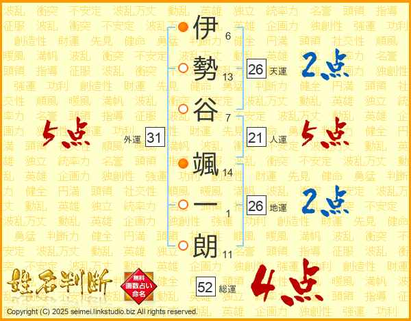 伊(6画)勢(13画)谷(7画) 颯(14画)一(1画)朗(11画)