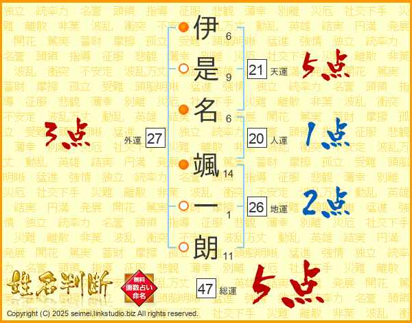 伊(6画)是(9画)名(6画) 颯(14画)一(1画)朗(11画)