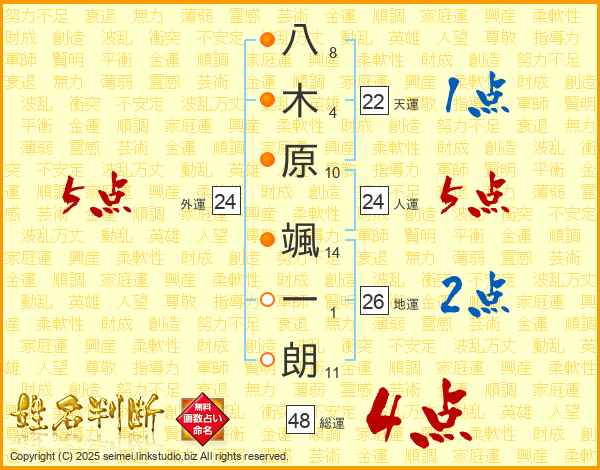 八(8画)木(4画)原(10画) 颯(14画)一(1画)朗(11画)