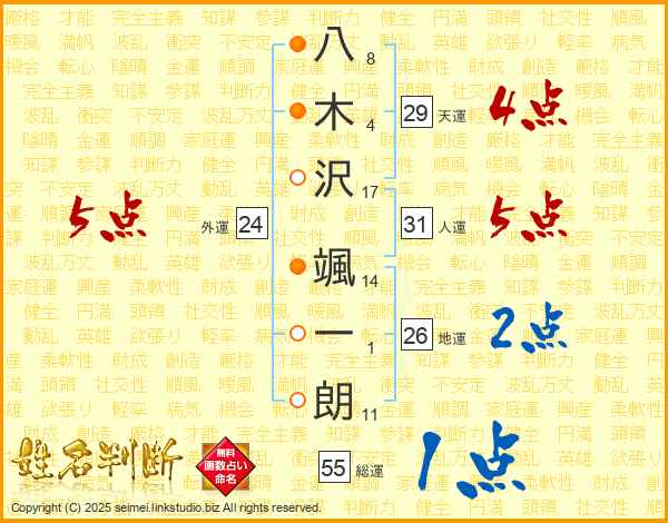 八(8画)木(4画)沢(17画) 颯(14画)一(1画)朗(11画)