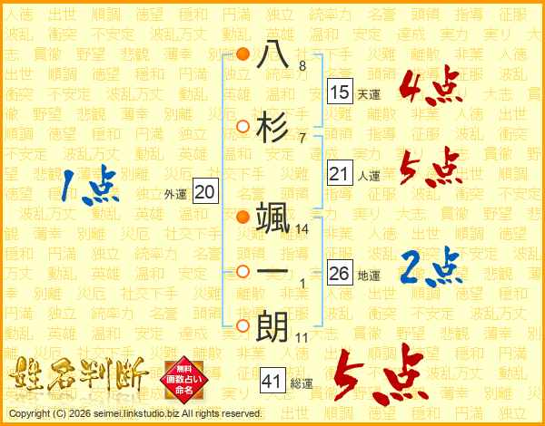 八(8画)杉(7画) 颯(14画)一(1画)朗(11画)