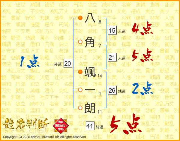 八(8画)角(7画) 颯(14画)一(1画)朗(11画)