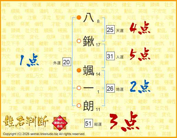 八(8画)鍬(17画) 颯(14画)一(1画)朗(11画)