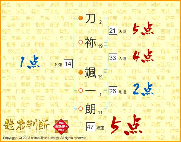 刀(2画)祢(19画) 颯(14画)一(1画)朗(11画)