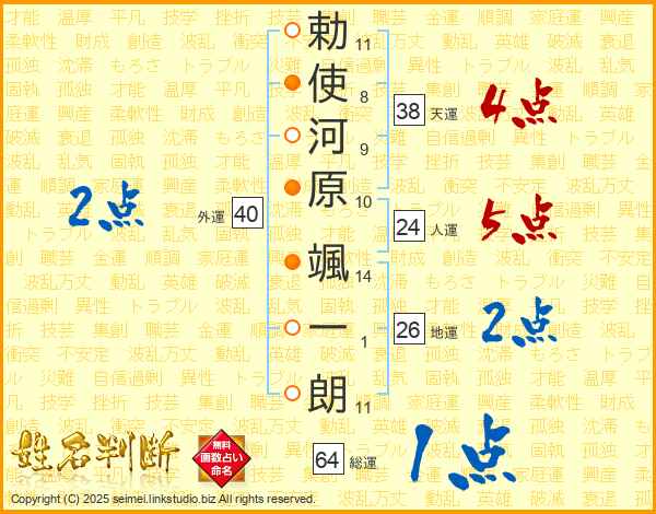 勅(11画)使(8画)河(9画)原(10画) 颯(14画)一(1画)朗(11画)