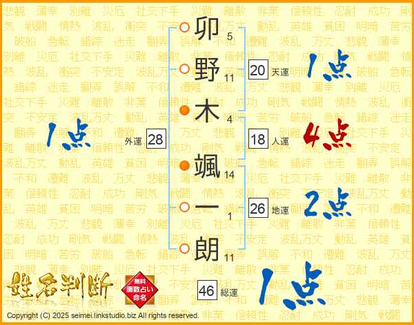 卯(5画)野(11画)木(4画) 颯(14画)一(1画)朗(11画)