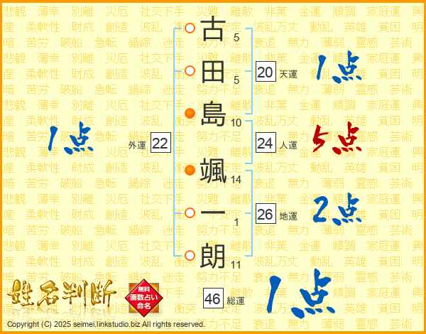 古(5画)田(5画)島(10画) 颯(14画)一(1画)朗(11画)