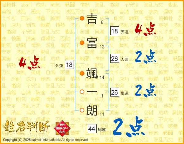 吉(6画)富(12画) 颯(14画)一(1画)朗(11画)