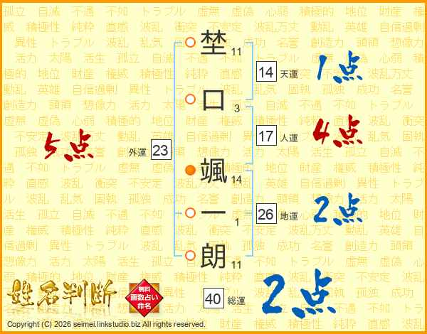 埜(11画)口(3画) 颯(14画)一(1画)朗(11画)