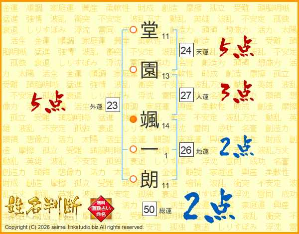 堂(11画)園(13画) 颯(14画)一(1画)朗(11画)