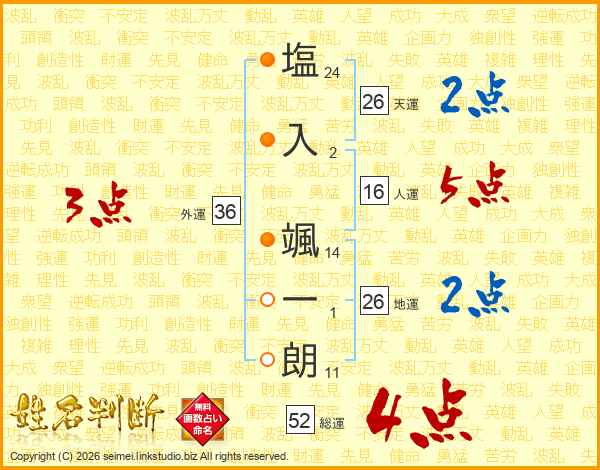 塩(24画)入(2画) 颯(14画)一(1画)朗(11画)