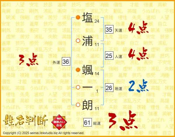 塩(24画)浦(11画) 颯(14画)一(1画)朗(11画)
