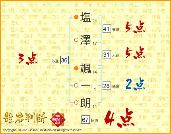 塩(24画)澤(17画) 颯(14画)一(1画)朗(11画)