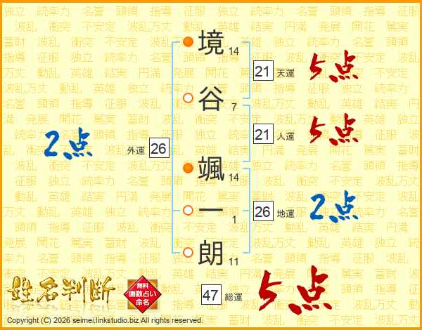 境(14画)谷(7画) 颯(14画)一(1画)朗(11画)