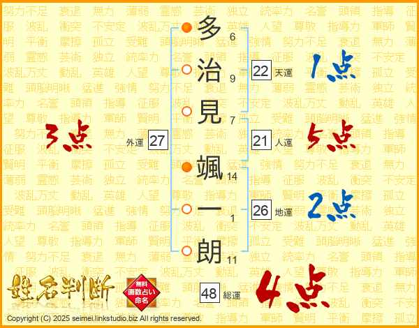 多(6画)治(9画)見(7画) 颯(14画)一(1画)朗(11画)