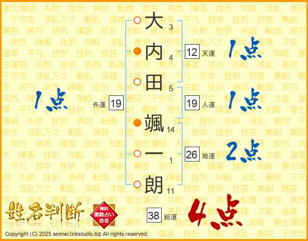 大(3画)内(4画)田(5画) 颯(14画)一(1画)朗(11画)