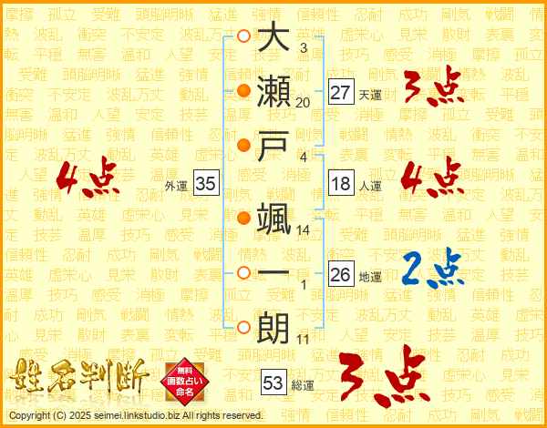 大(3画)瀬(20画)戸(4画) 颯(14画)一(1画)朗(11画)