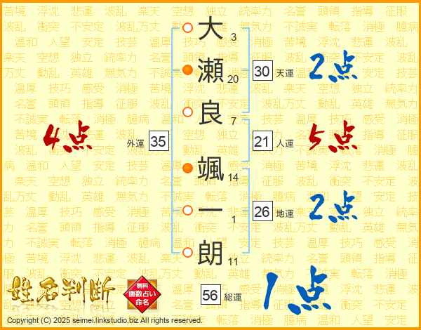 大(3画)瀬(20画)良(7画) 颯(14画)一(1画)朗(11画)