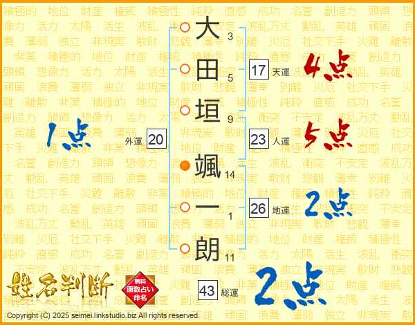 大(3画)田(5画)垣(9画) 颯(14画)一(1画)朗(11画)