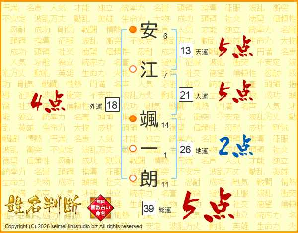 安(6画)江(7画) 颯(14画)一(1画)朗(11画)