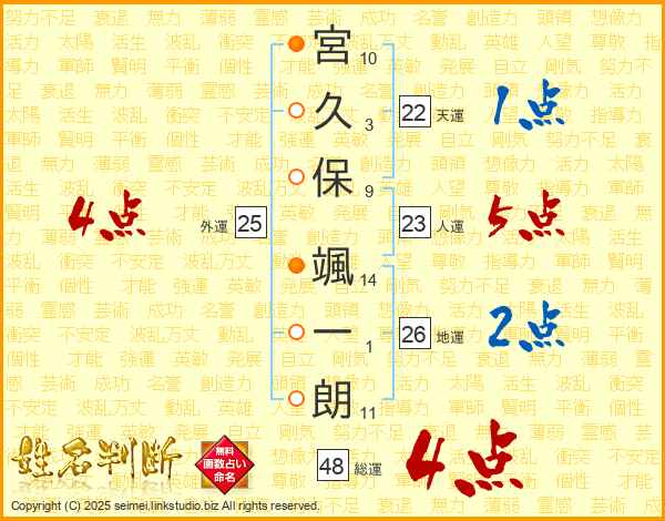 宮(10画)久(3画)保(9画) 颯(14画)一(1画)朗(11画)