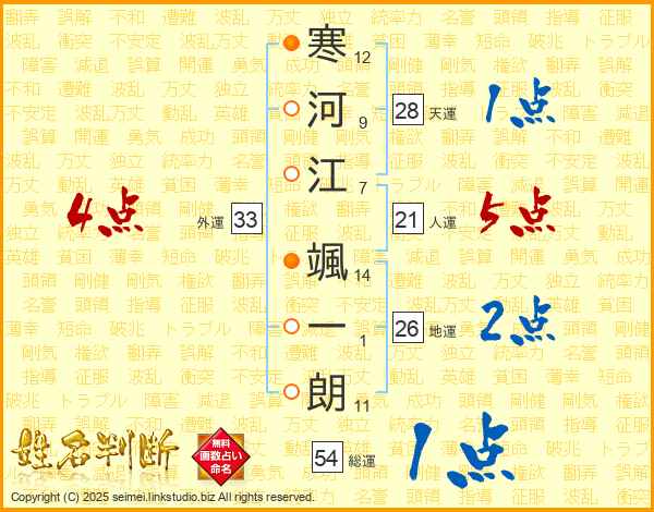 寒(12画)河(9画)江(7画) 颯(14画)一(1画)朗(11画)