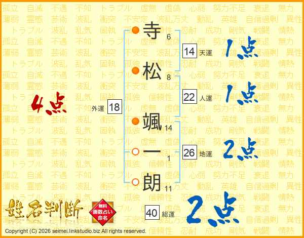 寺(6画)松(8画) 颯(14画)一(1画)朗(11画)