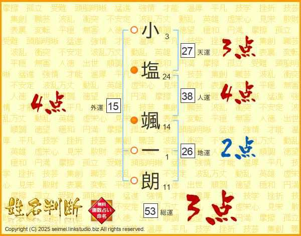 小(3画)塩(24画) 颯(14画)一(1画)朗(11画)