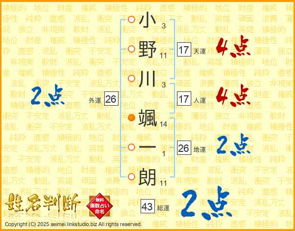 小(3画)野(11画)川(3画) 颯(14画)一(1画)朗(11画)