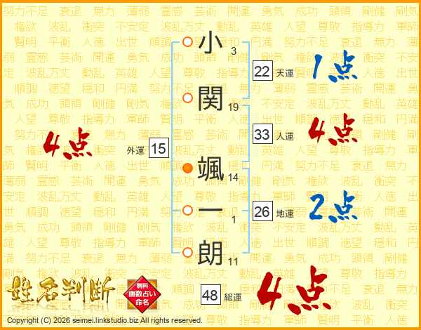 小(3画)関(19画) 颯(14画)一(1画)朗(11画)
