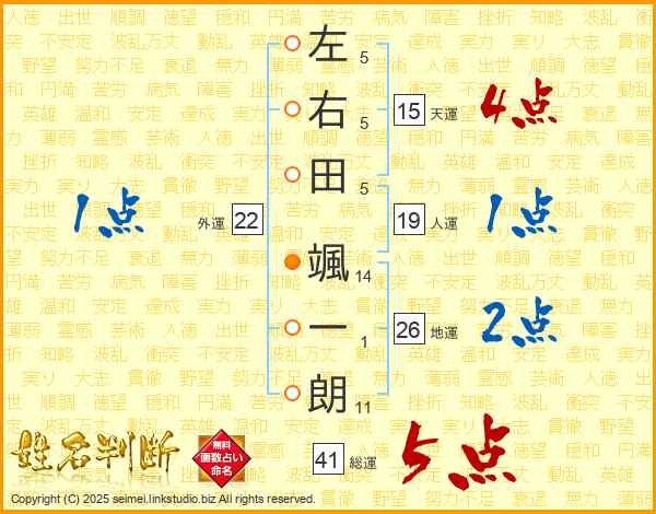 左(5画)右(5画)田(5画) 颯(14画)一(1画)朗(11画)