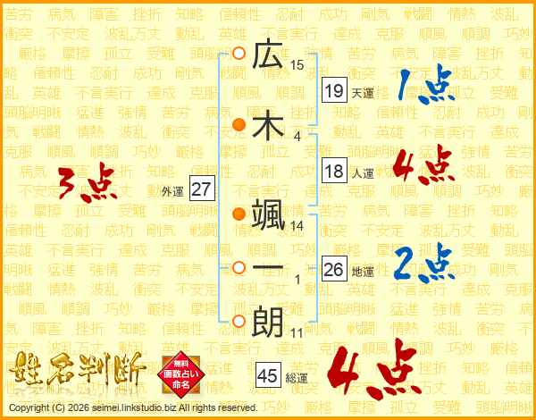 広(15画)木(4画) 颯(14画)一(1画)朗(11画)