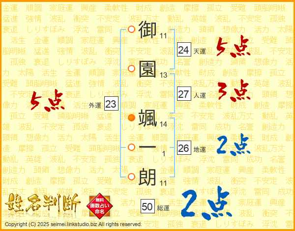 御(11画)園(13画) 颯(14画)一(1画)朗(11画)