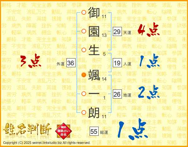 御(11画)園(13画)生(5画) 颯(14画)一(1画)朗(11画)