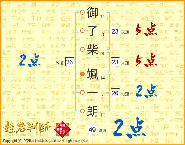 御(11画)子(3画)柴(9画) 颯(14画)一(1画)朗(11画)