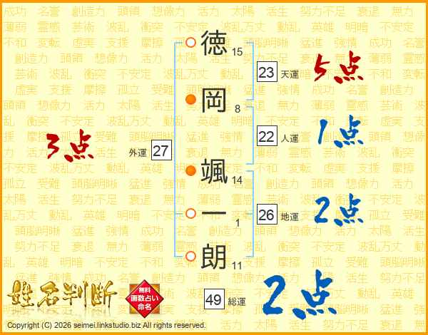 徳(15画)岡(8画) 颯(14画)一(1画)朗(11画)