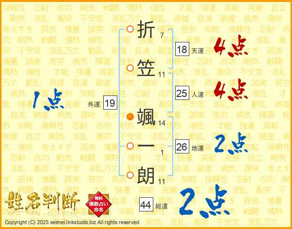 折(7画)笠(11画) 颯(14画)一(1画)朗(11画)