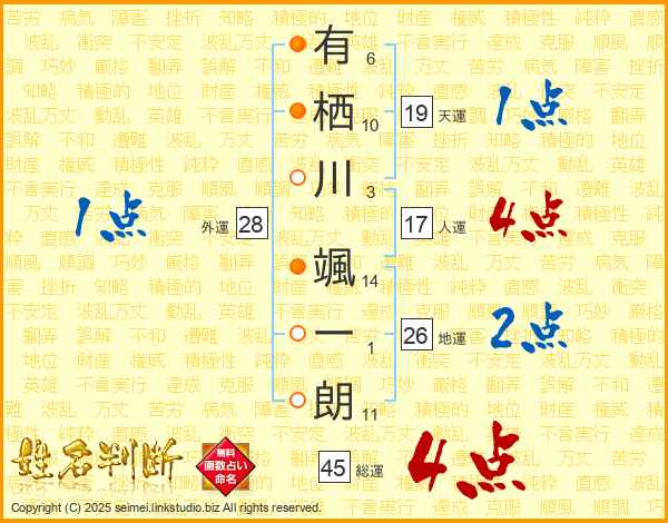 有(6画)栖(10画)川(3画) 颯(14画)一(1画)朗(11画)